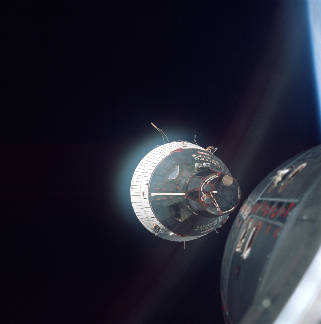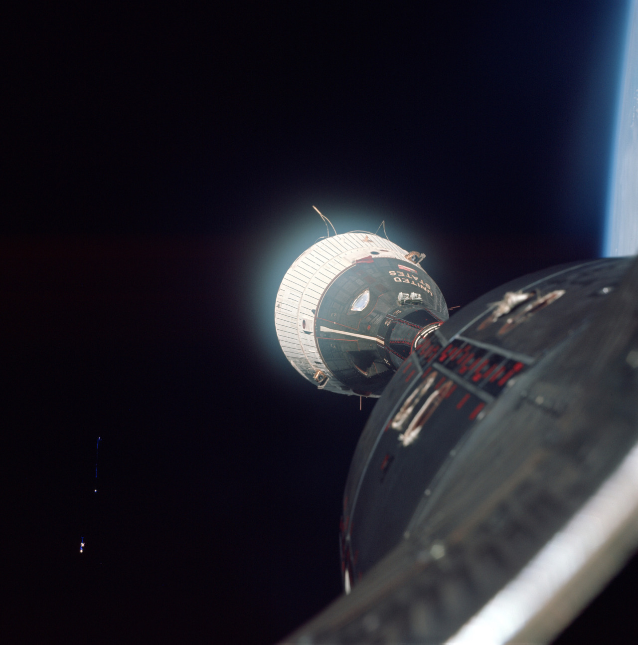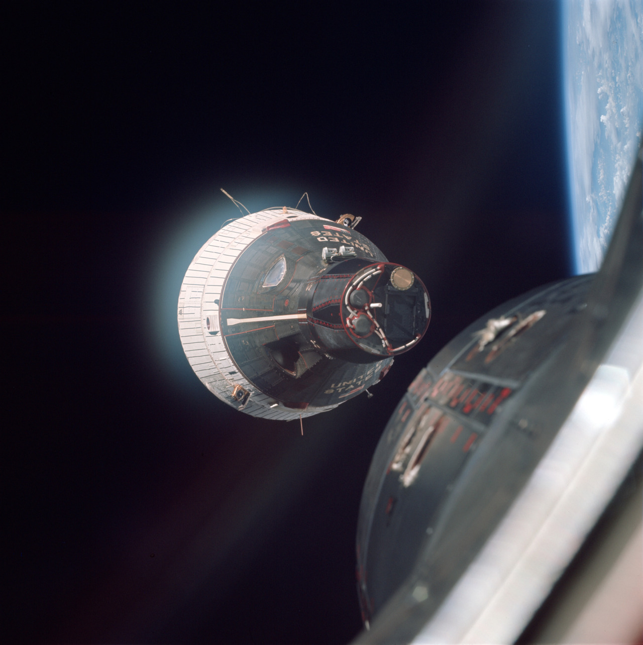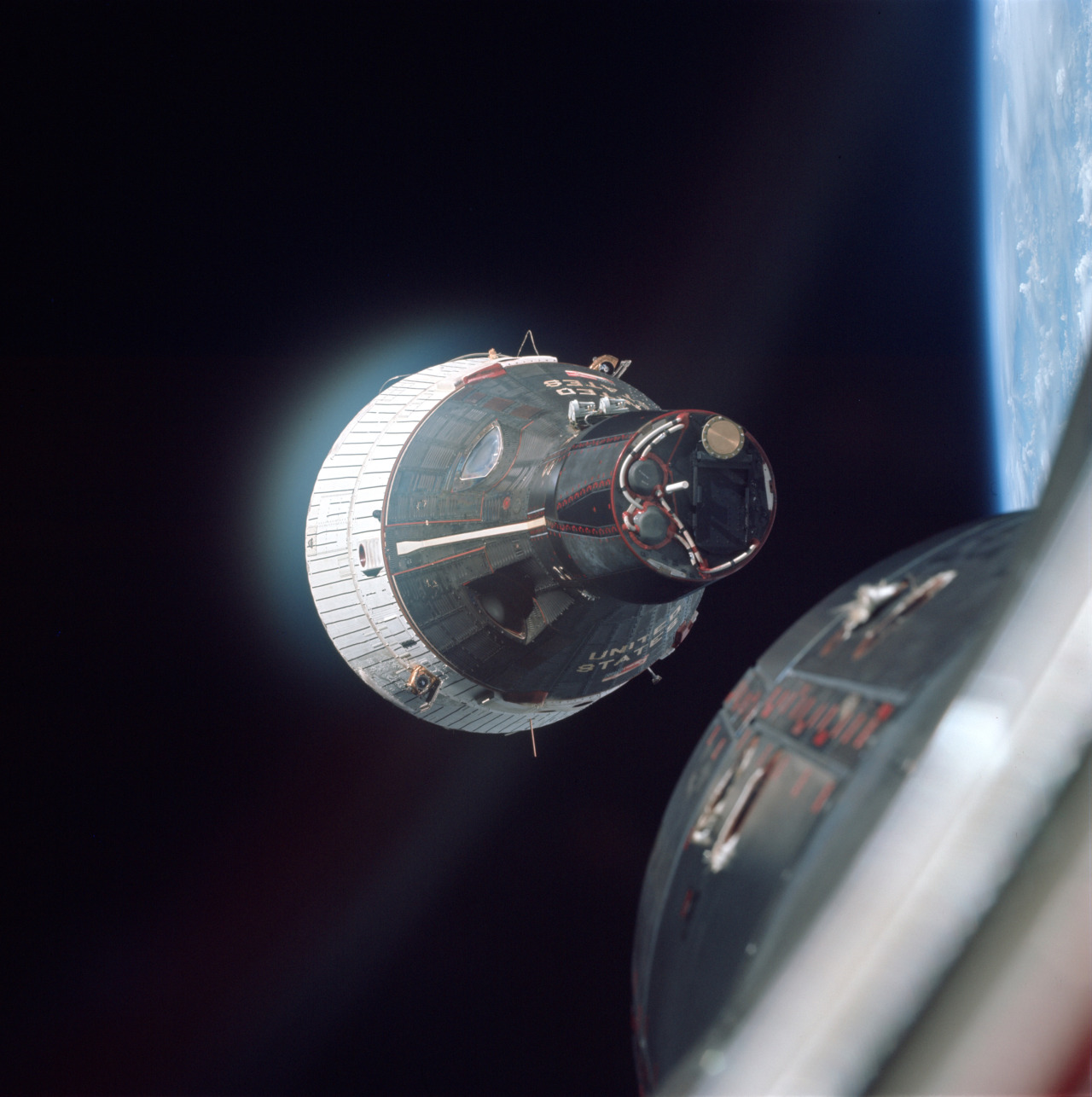 The Gemini 7 spacecraft, as seen from Gemini 6 on this day in 1965. It was the first-ever crewed rendezvous in space.