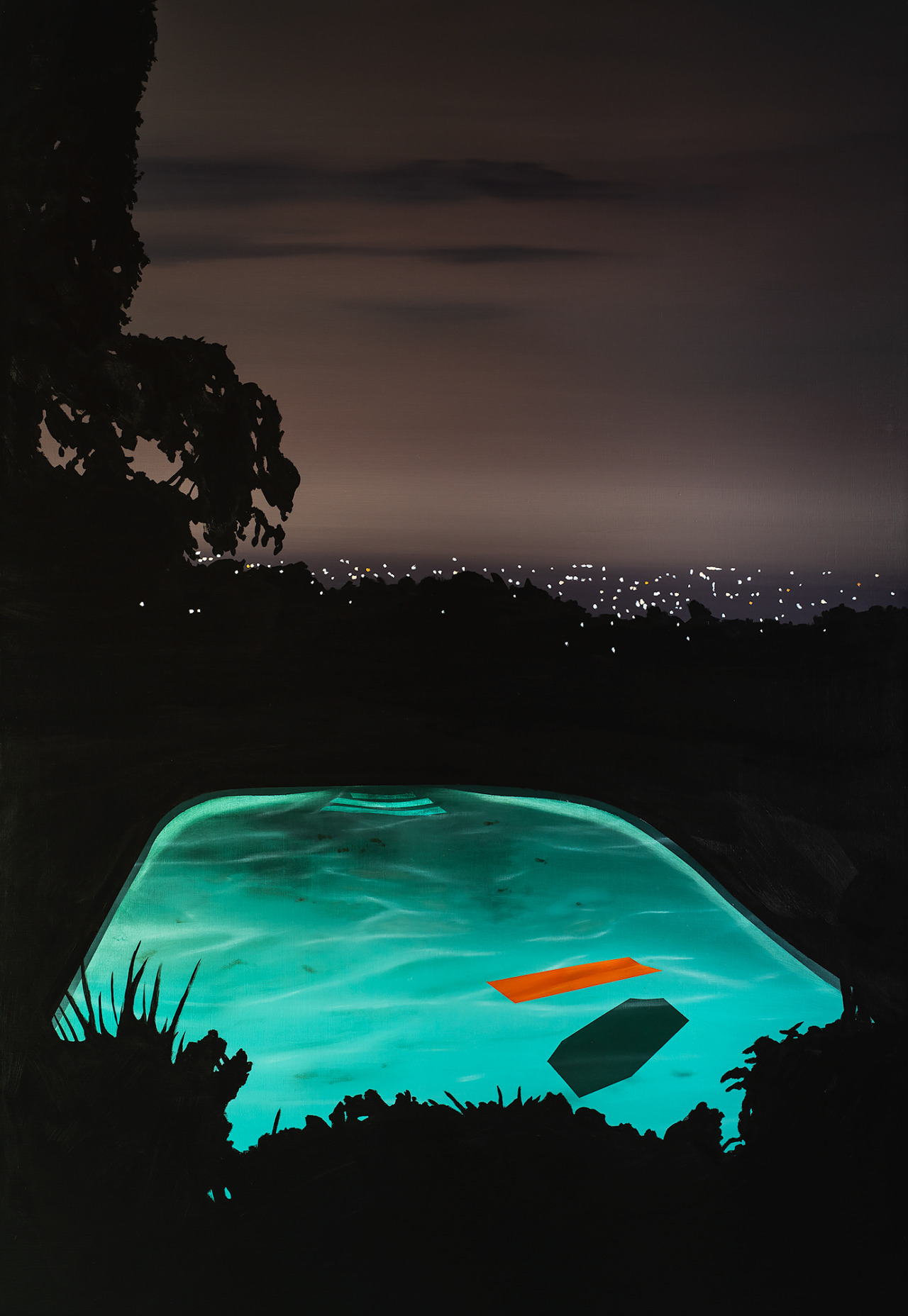 Laurence Jones (British, based Reading, Berkshire, England) - 1: Black Palms at Dawn, 2019 2: Pool with Orange Float, 2019, Paintings: Acrylic on Linen