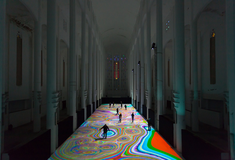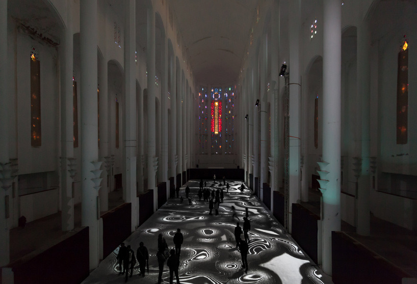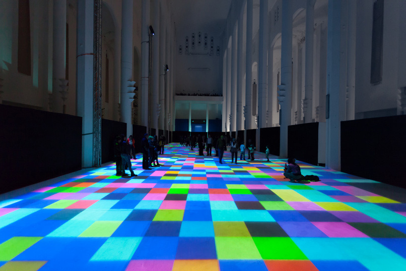 Magic carpets 2014 by french artist Miguel Chevalier is an interactive light display spread out across the floor of the former sacré coeur church in Casablanca, Morocco. Covering it with a huge layer of light, the work references the world of biology, microorganisms, and cellular automata – as cells have the ability to multiply in abundance, divide and merge at different paces. Pieces come together, fall apart and transform in shape at rapid speeds. the displayed organic universe mingles with a digital construction of overlapping pixels.