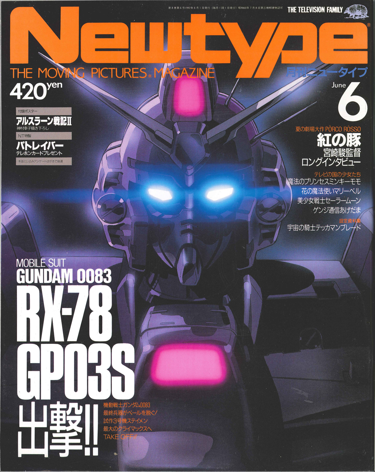 Front cover of the 6/1992 issue of Newtype. Cover story for this issue is Gundam: 0083 Stardust memory. There are also articles for Porco Rosso, Silent Mobius and Ushio & Tora.