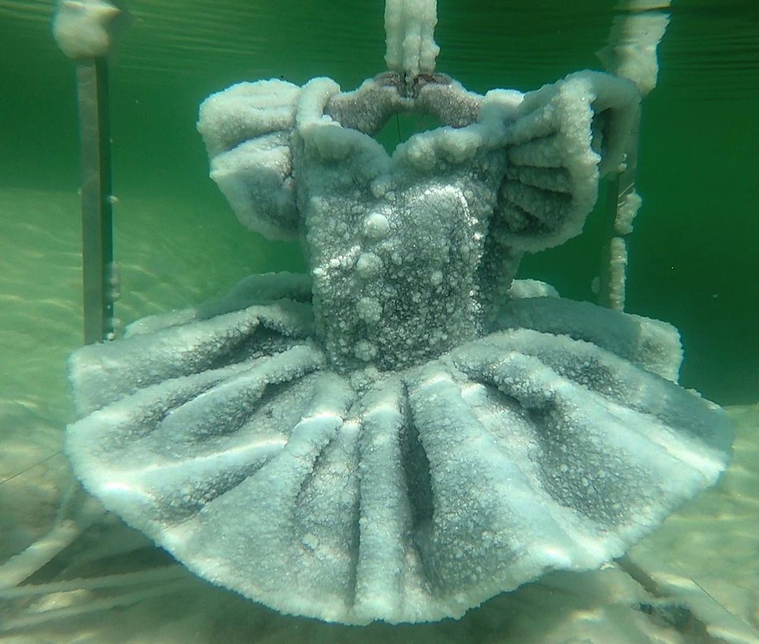 Crystallised dress left in the Dead Sea for 2 months by Sigalit Landau, 2016