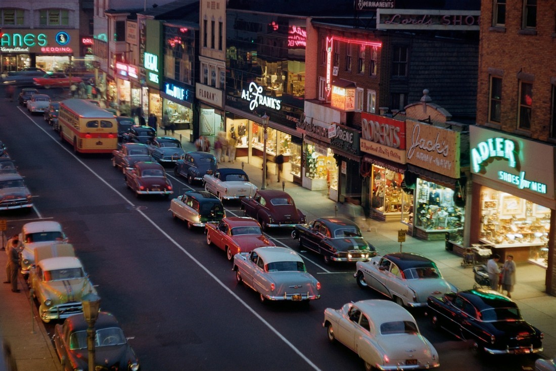 Main Street at dusk, 1950s; Photo by William Gottlieb