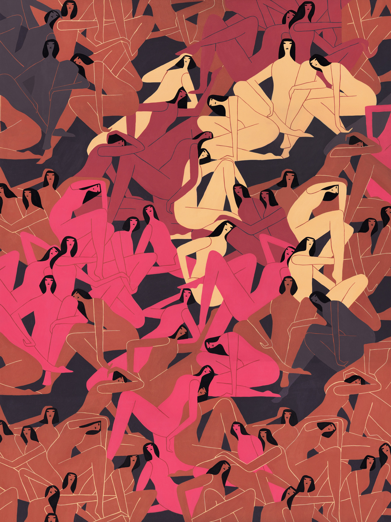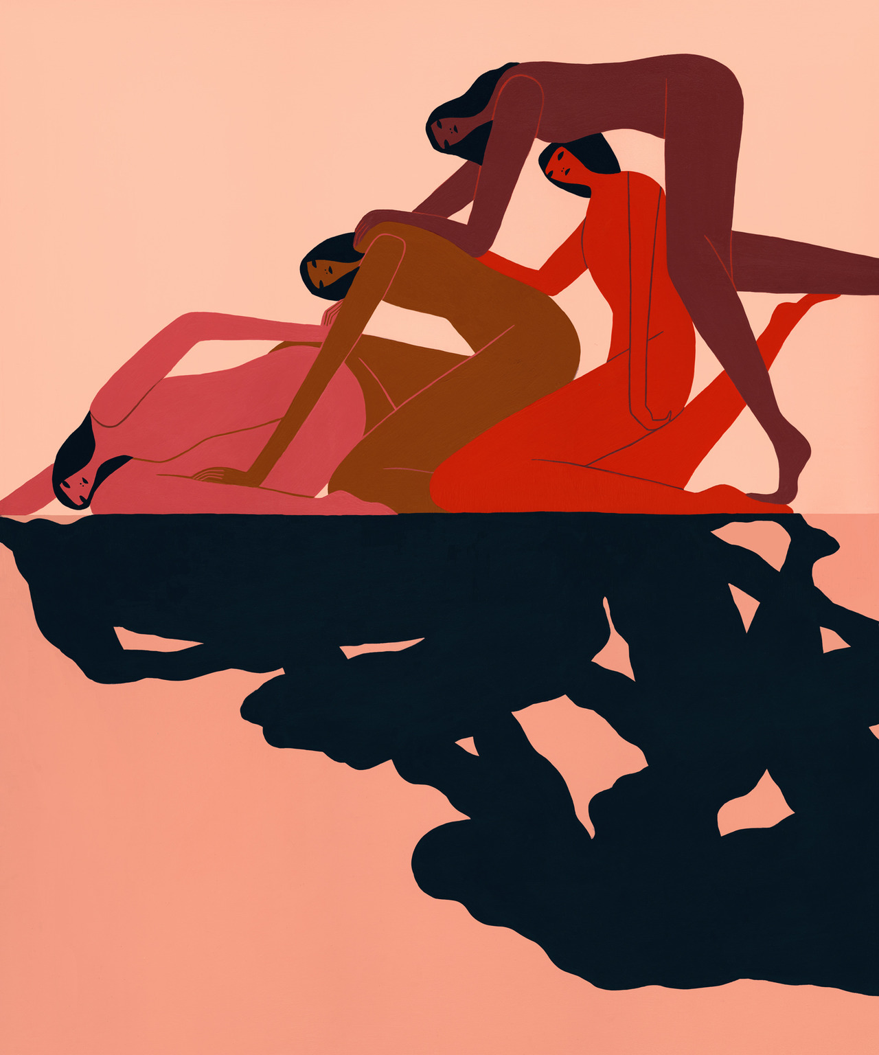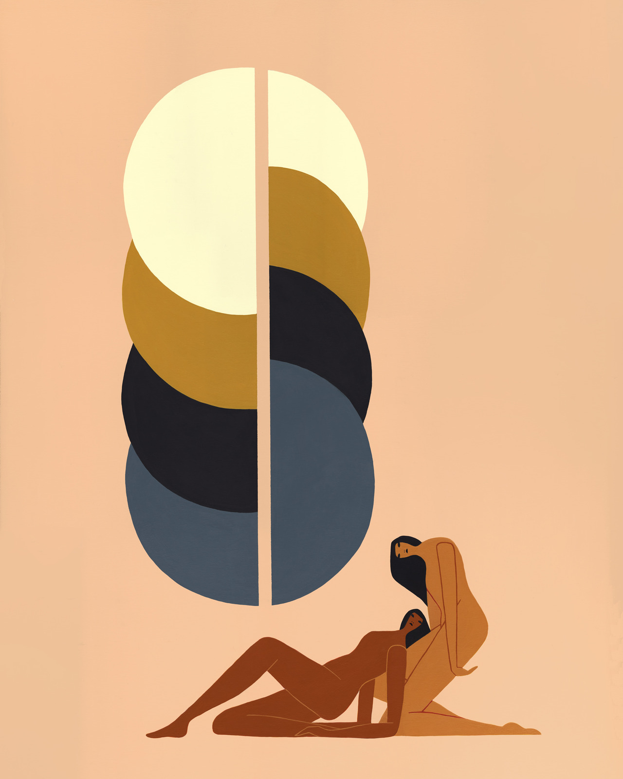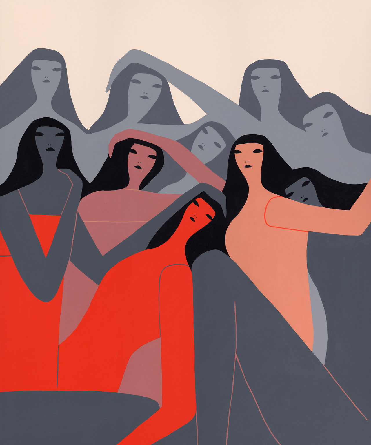 Concise female figures commune, dance and support one another in Berger’s acrylic on panel paintings.  Each character is at once an individual totem and an integral piece of a larger composition upholding the communities created within each of Berger’s paintings.